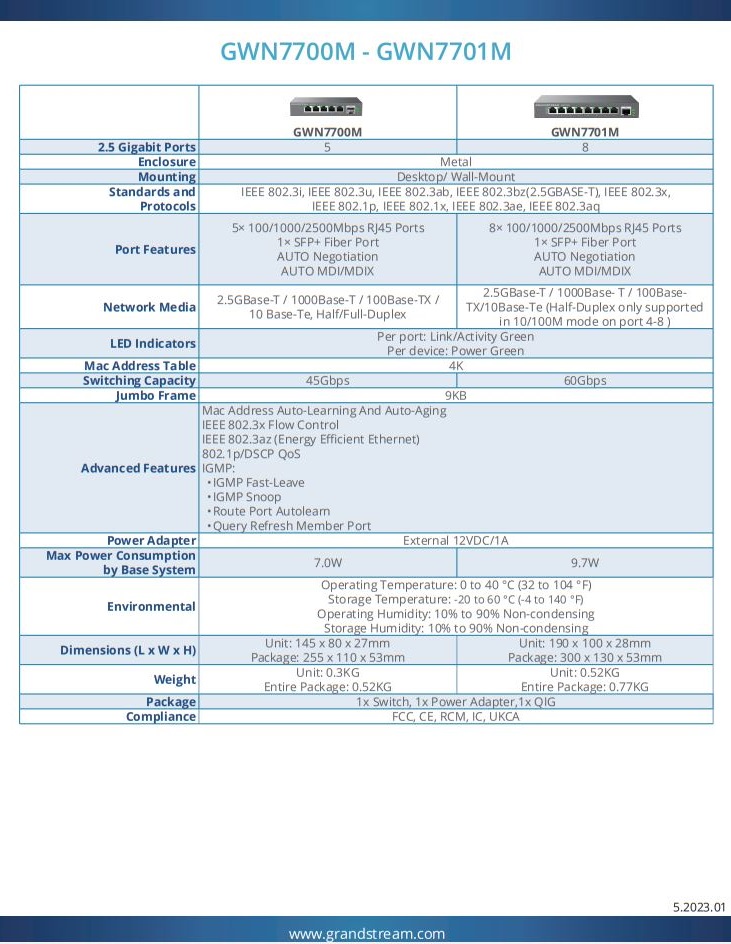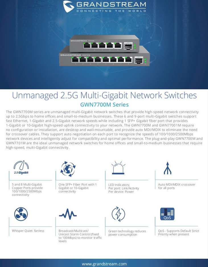 The GWN7700M series are 5  port unmanaged multi-Gigabit network switches that provide high-speed network connectivity up to 2.5Gbps to home offices and small-to-medium businesses